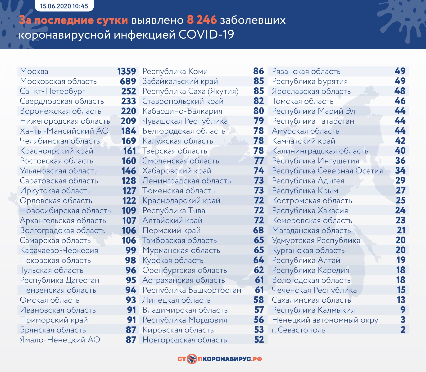 За весь период в России зафиксировано 7 091 летальный исход, выздоровело 284 539 человек. В нашем регионе сейчас под медицинским наблюдением остается 1 037 человек, 3 942 — на перевахтовке, 4 пациента на ИВЛ. Кроме этого, как сообщают в региональном оперштабе. Новой инфекцией сейчас болеет 10 детей.