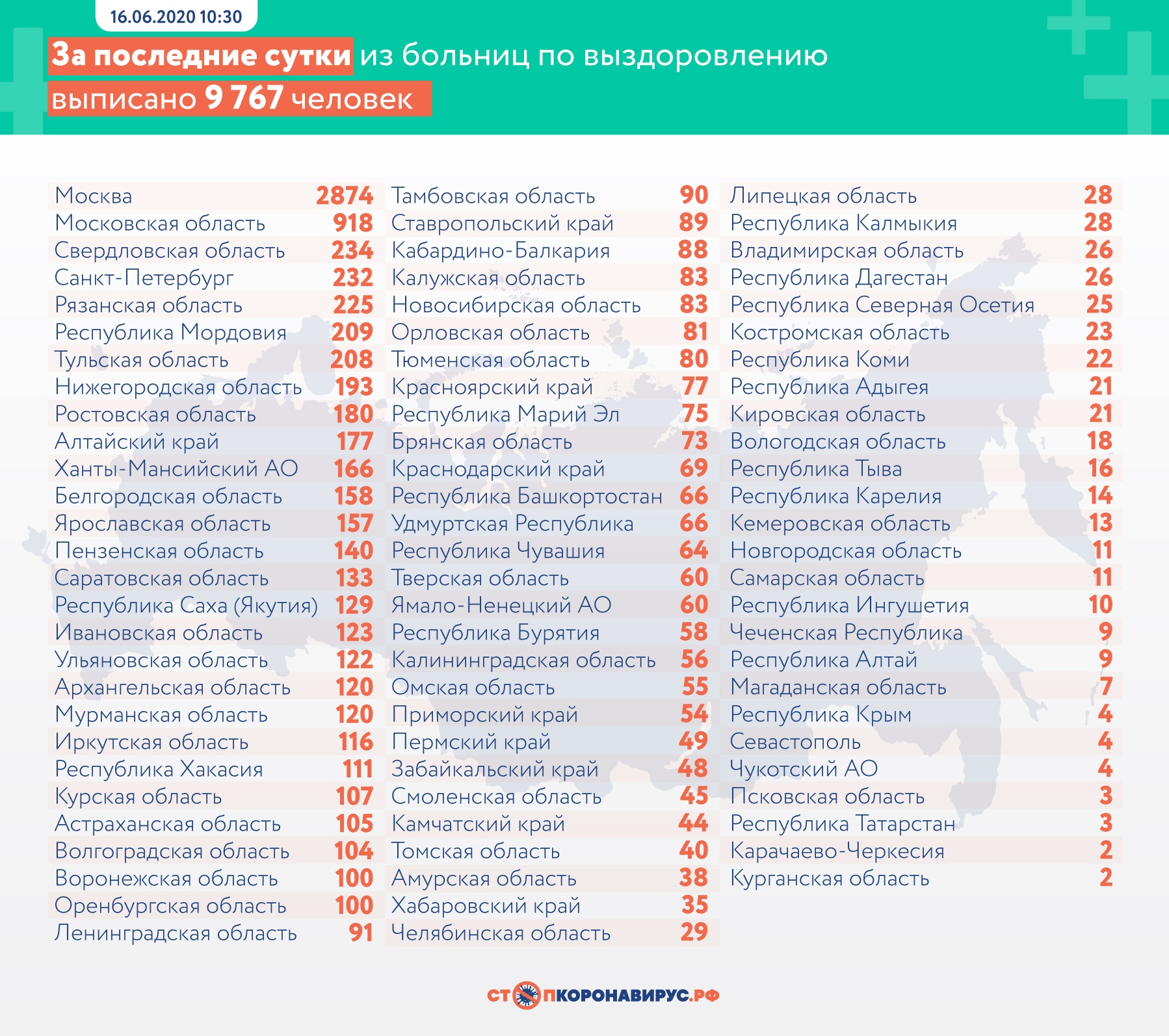 В России за последние сутки заразилось еще 8 248 человек в 82 регионах. Из них 35,8% не имели клинических проявлений болезни. Зафиксировано 193 летальных исхода, а полностью выздоровели 9 767 человек. Всего на сегодняшний день в нашей стране выявлено 545 458 случаев. За весь период умерло 7 248 пациентов, выздоровело — 294 306.