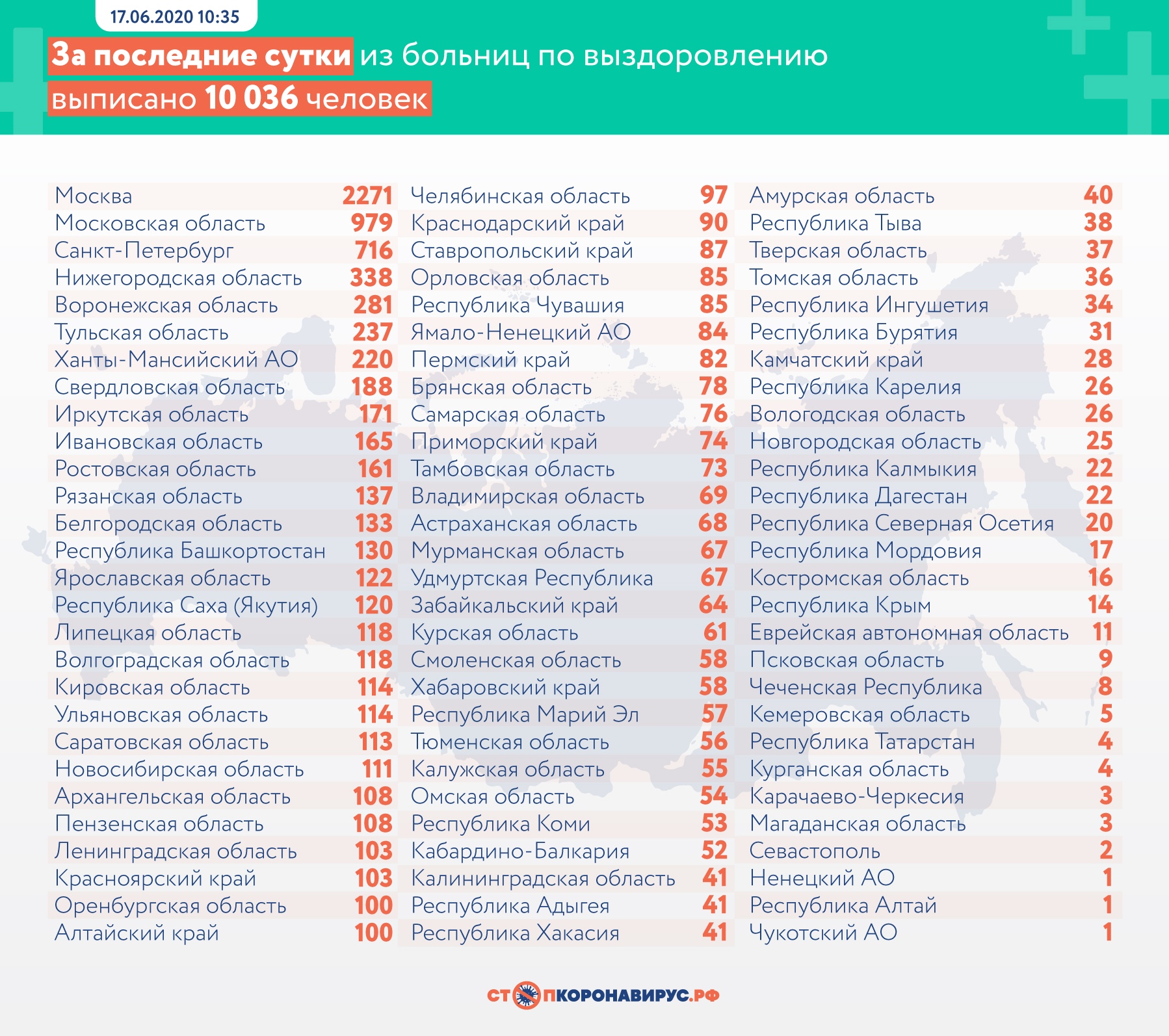 На сегодняшний день COVID-19 выявлен у 553 301 пациента в 85 регионах. За весь период зафиксировано 7 478 летальных исходов, выздоровело 304 342 человека.