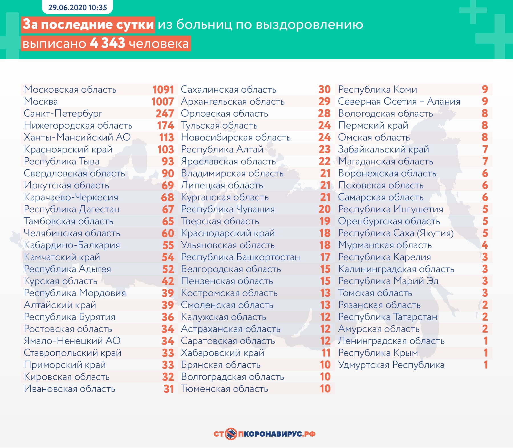 Больше всего заболевших в Москве (+782 за сутки), Московской области (+335), Ханты-Мансийском автономном округе (+277), Иркутской области (+236) и Санкт-Петербурге (+219). Меньше всего — в Чеченской Республике (+14), Курганской области (+14), Калининградской области (+10), Еврейской автономной области (+3) и Севастополе (+1).