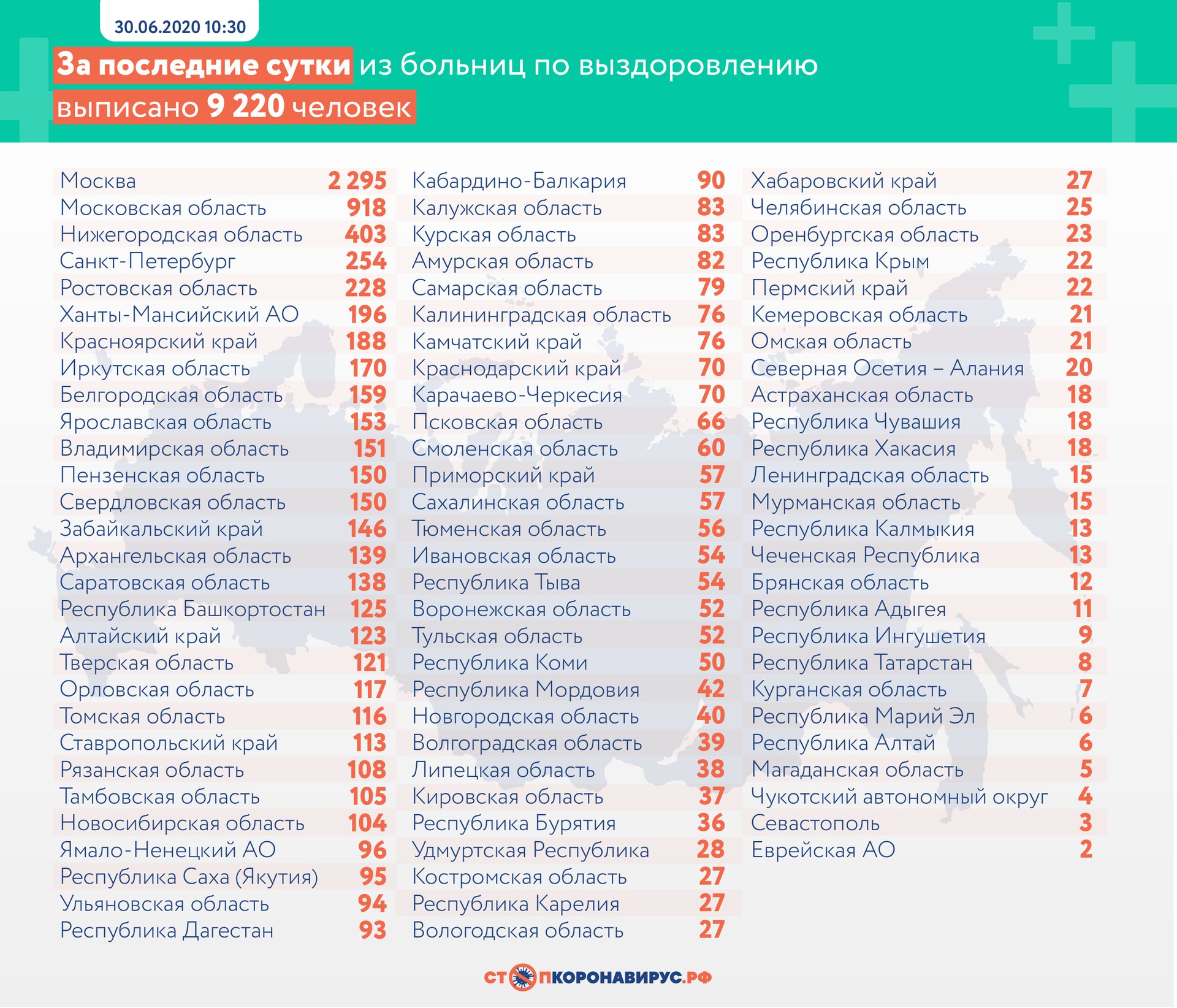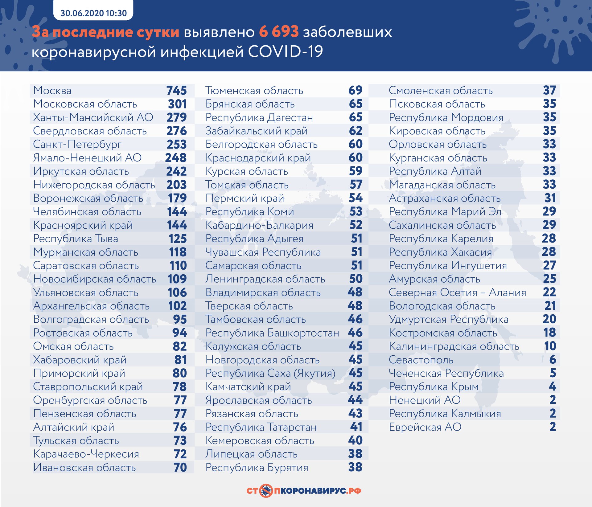 За минувшие сутки в России выявили 6693 новых случая коронавируса в 84 регионах. Как сообщает оперативный штаб Москвы, 30,2% из них не имели клинических проявлений болезни. 154 человека скончались, 9220 полностью выздоровели.