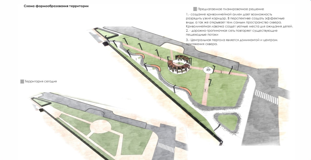 В сквере также установят лавочки с круглыми формами и сделают пешеходные дорожки с плавными линиями.