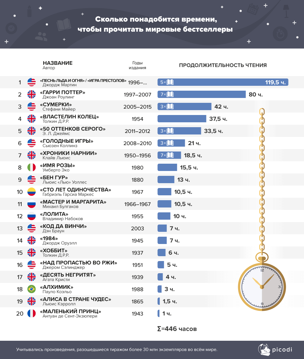 В рейтинге учитывались книги, разошедшиеся тиражом более 30 млн экземпляров во всем мире. Абсолютным рекордсменом по длительности прочтения стала «Песнь льда и пламени» Джорджа Мартина – произведение, по которому был снят культовый сериал «Игра престолов» – 119 часов. Кстати, посмотреть сагу на экране займет значительно больше времени – 552 часа. На семь книг вселенной «Гарри Поттера» от Джоан Роулинг среднестатистический читатель потратит 80 часов, на трилогию «Сумерки» от Стефани Майер – 42 часа.