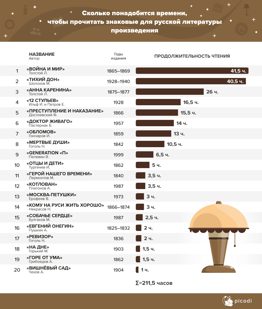 Рейтинг российских произведений возглавила «Война и мира» Льва Толстого – 41,5 часа. «Тихий дон» Михаила Шолохова займет у читателя 40,5 часа, на третьем место снова Лев Толстой, но уже с «Анной Карениной» – 26 часов.