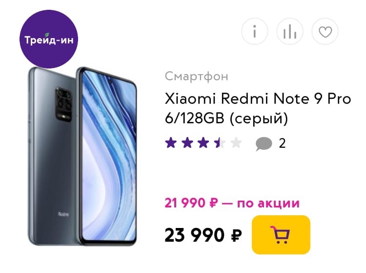 Смартфон Xiaomi Redmi Note 9 Pro 6/128 обойдется покупателю в 21 990 руб., а не 23 990 руб., — эта цена так же не включает в себя скидку по промокоду.