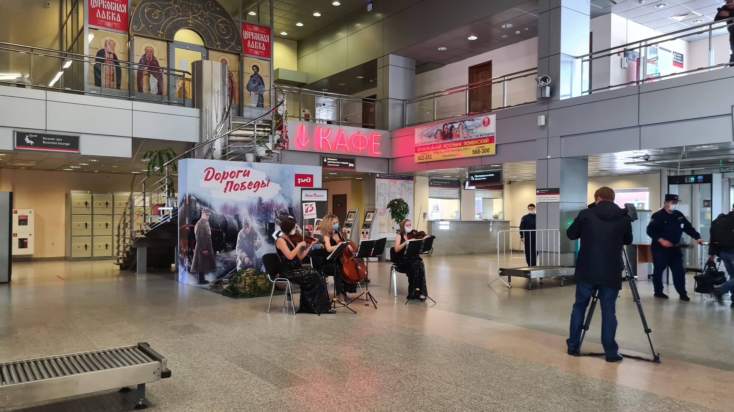 На тюменском железнодорожном вокзале проходит концерт для пассажиров. Путников встречает струнное трио: это подарок в честь 17-й годовщины образования ОАО «РЖД».