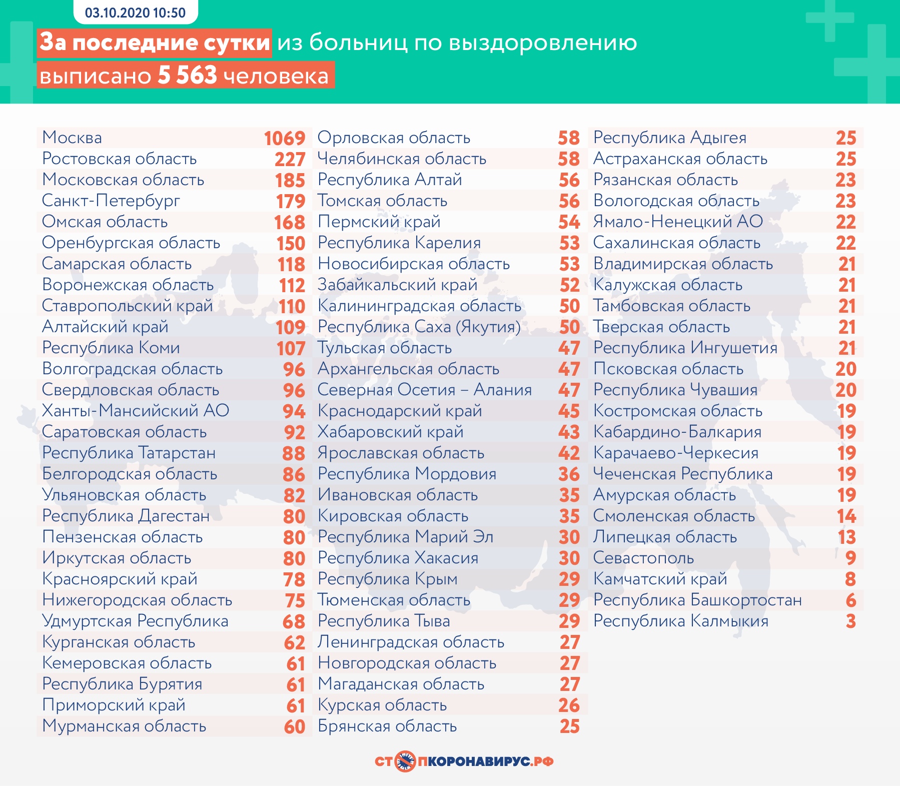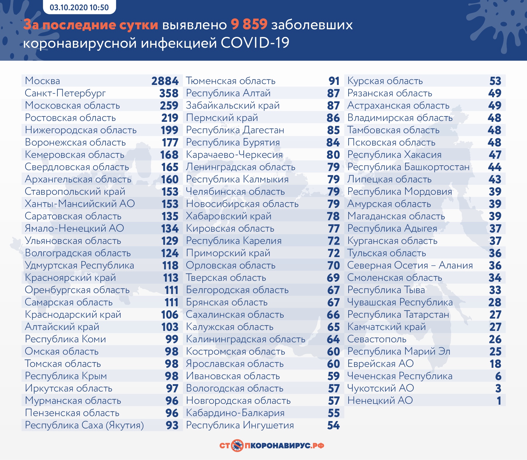За последние сутки в России выявлено 9 859 заболевших коронавирусной инфекцией COVID-19 в 85 регионах, из них 2 680 случаев (27,2%) — активно у контактных лиц без клинических проявлений болезни.