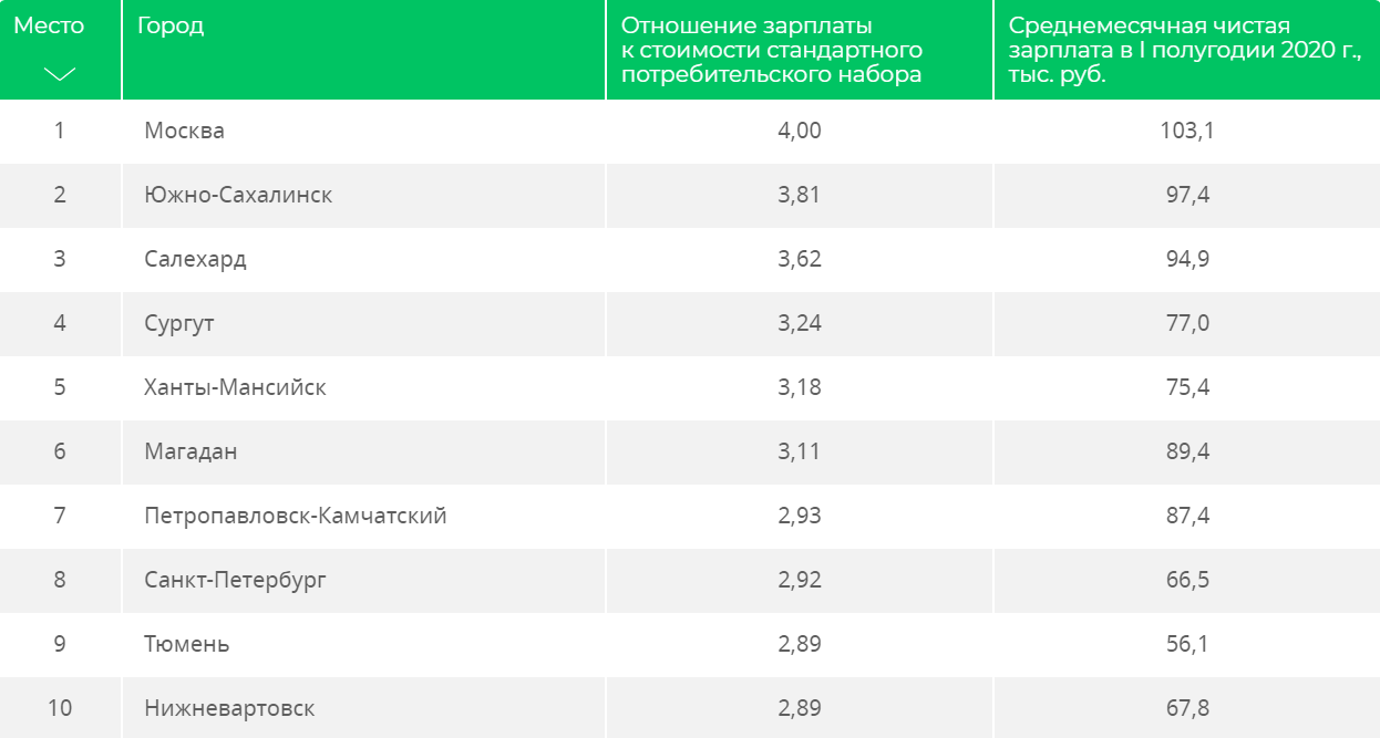 Первое заняла Москва — среднемесячная чистая зарплата в первом полугодии 2020 года здесь составила 103 тысячи рублей. Тюмень расположилась на 9-й строчке с 56,1 тысячи рублей. Смотри, как выглядит десятка лидеров: