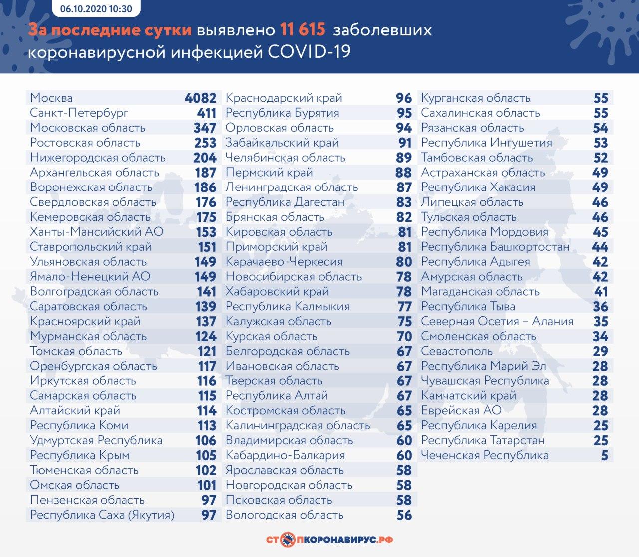 В России за последние сутки зарегистрировано 11 615 новых случаев коронавируса. Выписаны по выздоровлении 6 252 человека, погибли — 188.