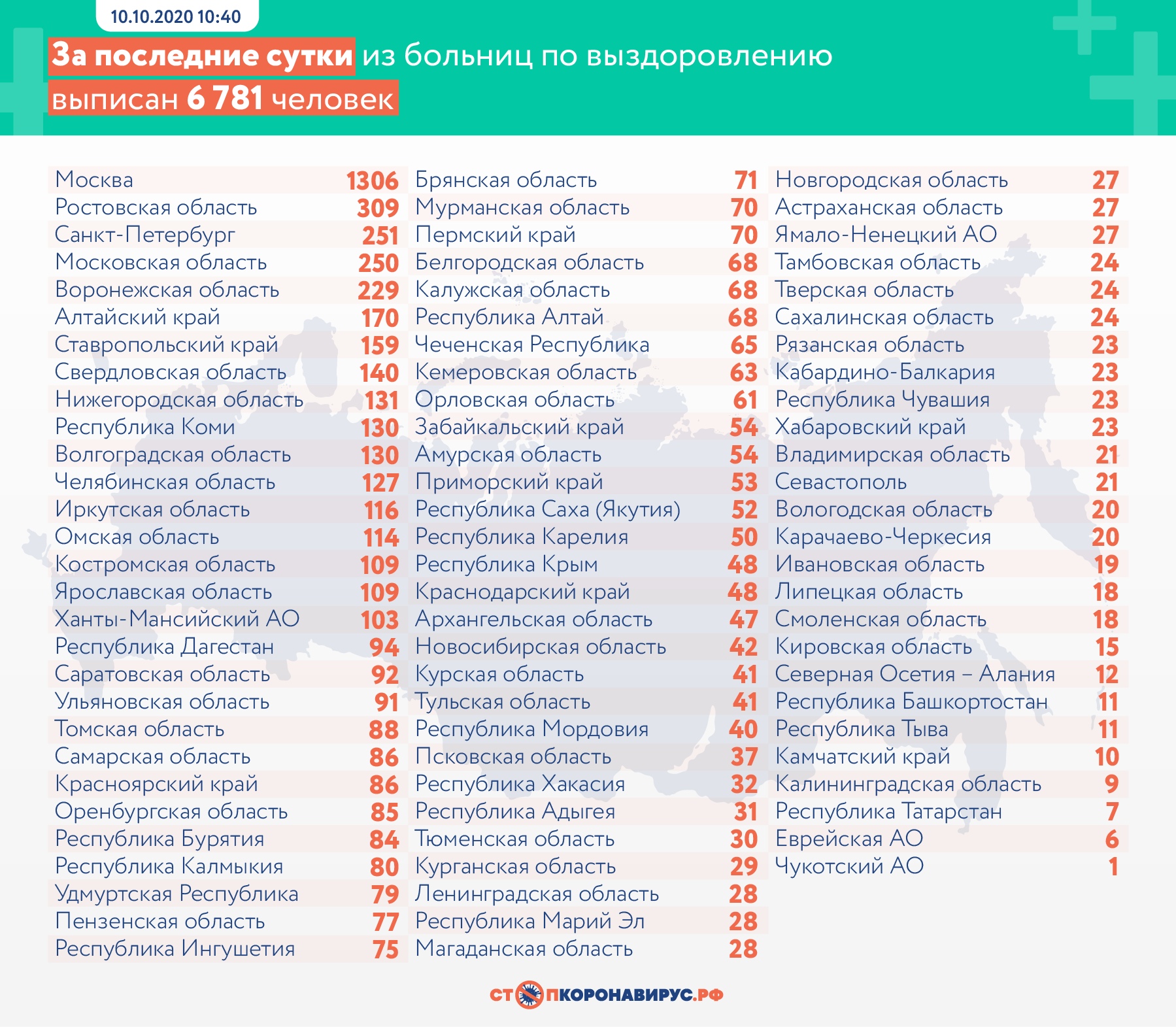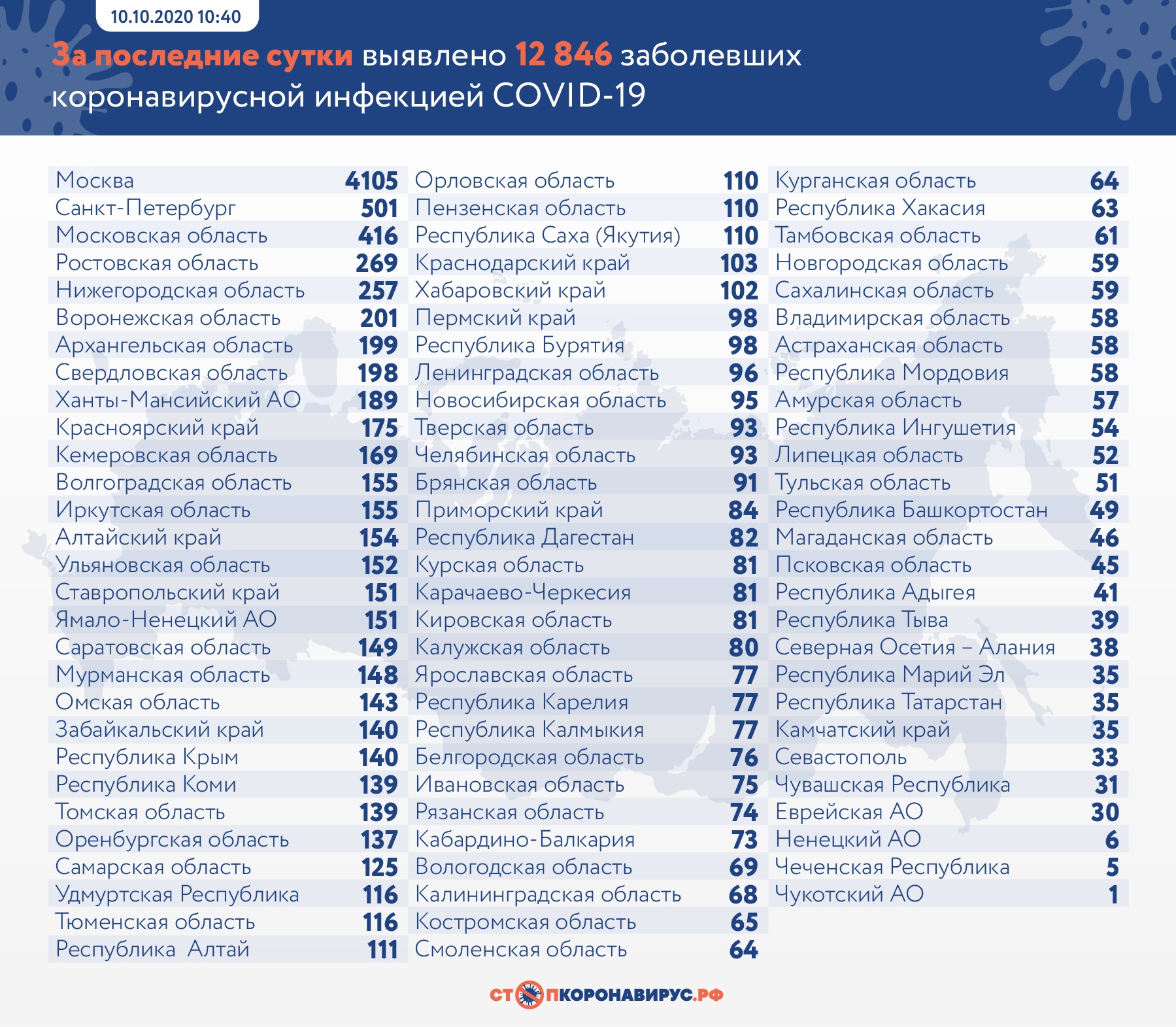 За 9 октября в России выявлено 12 846 человек в 85 регионах, заболевших коронавирусом. Из них 3 338 случаев (26,0%) — активно у контактных лиц без клинических проявлений болезни.