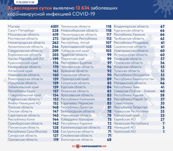 За минувшие сутки в России выявили 13 634 новых случая коронавируса в 85 регионах. Как сообщает оперативный штаб Москвы, 26,3% из них не имели клинических проявлений болезни. За сутки 149 человек скончались, 4 240 полностью выздоровели. За все время в стране зафиксировали 1 298 718 заболевших коронавирусом в 85 регионах: 1 020 422 человека выздоровели, 20 324 скончались.
