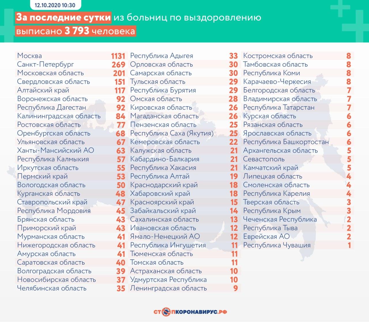 В России за последние сутки зарегистрировано 13 592 новых случая коронавируса. Выписаны по выздоровлении 3 793 человека, погибли — 125.
