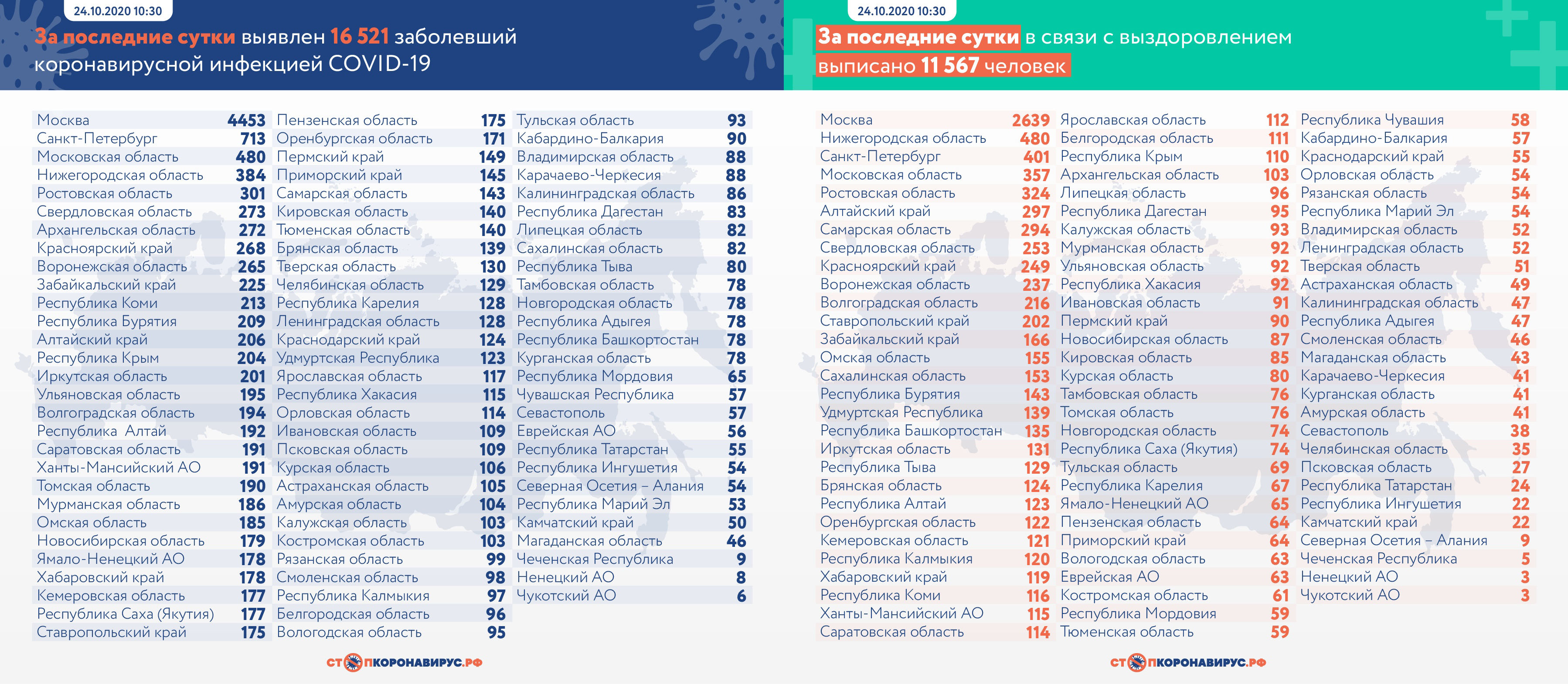 В России за последние сутки зарегистрирован 16 521 новый случай коронавируса в 85 регионах, из них 4 255 случаев (25,8%) — активно у контактных лиц без клинических проявлений болезни. От COVID-19 умерло 296 человек, полностью выздоровели 11 567 пациентов.