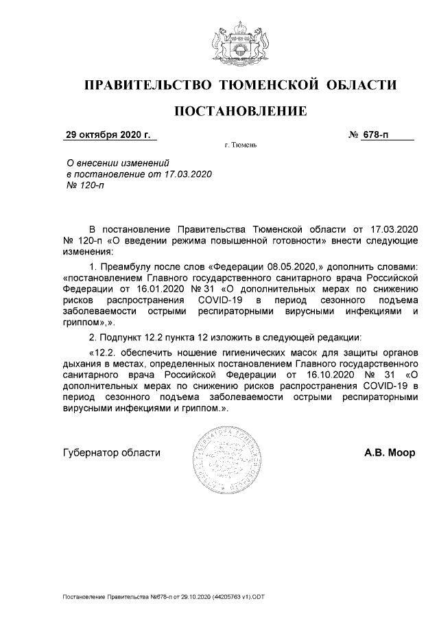 Губернатор Тюменской области подписал новое постановление об обеспечении масочного режима на территории Тюменской области. Документ появился на портале правовой информации региона. Закрывать кафе и рестораны в ночное время Александр Моор пока не стал.