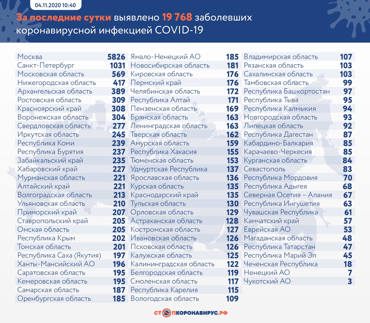 За минувшие сутки в России выявили 19 768 новых случаев коронавируса в 85 регионах. Как сообщает оперативный штаб Москвы, 25% из них не имели клинических проявлений болезни. За сутки 389 человек скончались, 15 567 полностью выздоровели. За все время в стране зафиксировали 1 693 454 заболевших коронавирусом в 85 регионах: 1 266 931 человек выздоровел, 29 217 скончались.