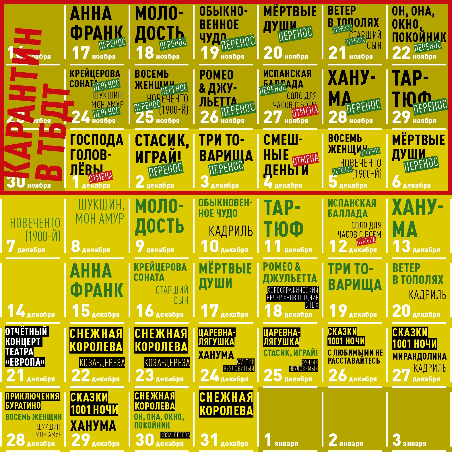 Всего на новые даты ТБДТ перенес 17 спектаклей. Со списком можно ознакомиться в посте. В театре отметили, что приобретенные ранее билеты будут действительны на новые даты.