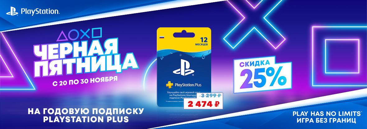 20 ноября в рамках «Черной пятницы» многие ритейлеры снизили цену на 12-месячную подписку PlayStation Plus. Если обычно она стоит 3 299 рублей, то сейчас — 2 474 рубля.