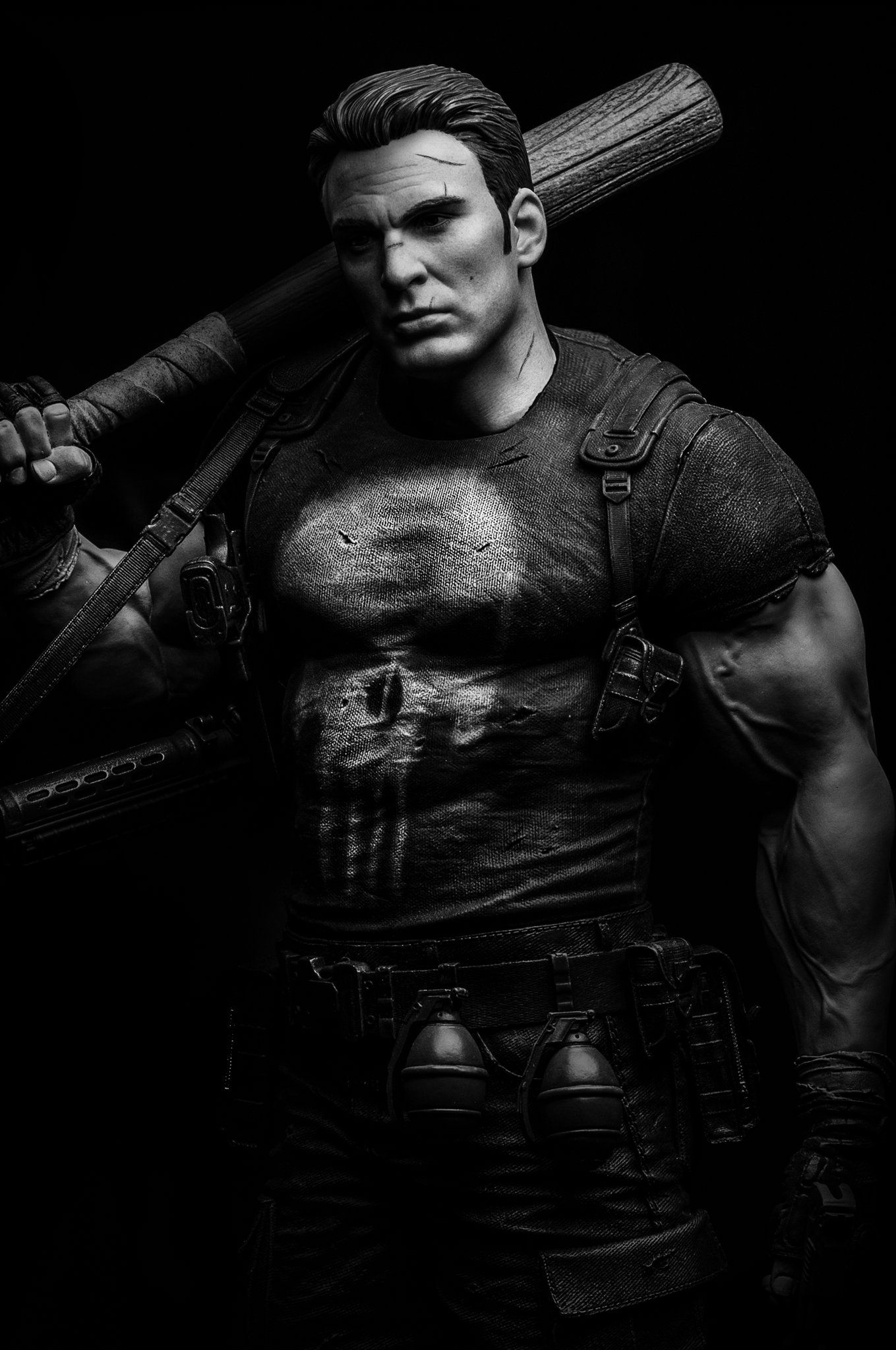 Эванс сыграл в киновселенной Marvel Капитана Америку, а в новой работе художника предстал в образе Карателя, сурового антигероя. На вооружении нового Криса Эванса старая бейсбольная бита, автомат и гранаты.