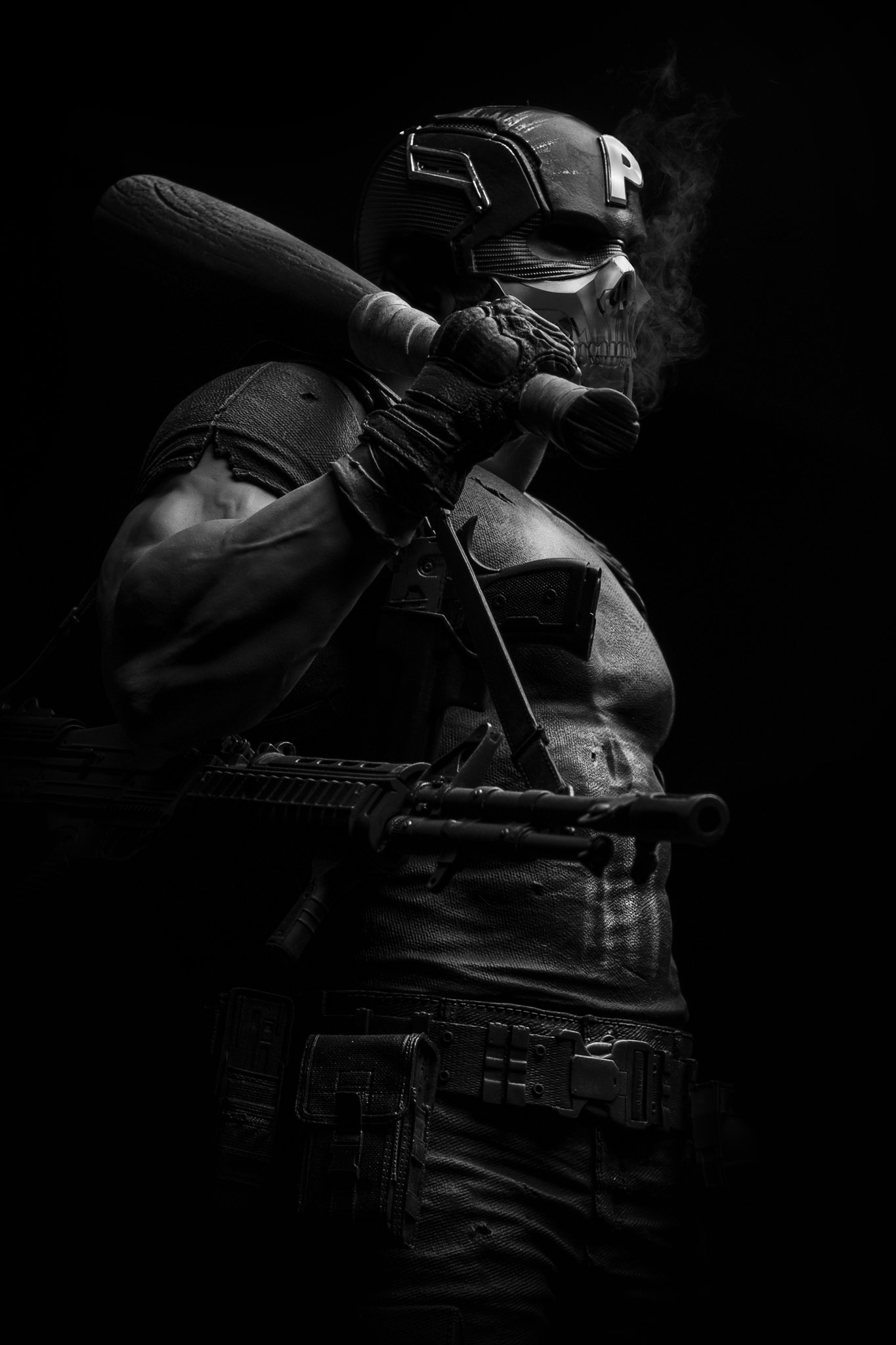 От высокоморального Стива Роджерса в этом образе остался только шлем, как у Кэпа. Но вместо буквы «А» на лбу теперь красуется «P» — Punisher, что означает Каратель. Также есть рисунок, в котором шлем персонажа дополнен маской в виде черепа.