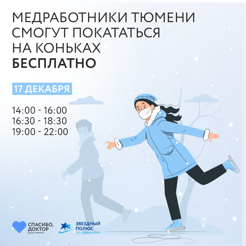 Бесплатный сеанс катания состоится с 14:00 до 22:00 на катке «Звездный полюс» (ул. Тимофея Чаркова, 60). Мини-мероприятие организовал директор катка Александр Андросов. Ранее он увидел в ТРЦ «Гудвин» фотозону, созданную в рамках проекта «Спасибо, доктор! Боремся с COVID-19». На ней можно оставлять пожелания врачам. Предпринимателю понравилась идея и он присоединился к проекту и решил порадовать всех медицинских работников в преддверии Нового года бесплатным сеансом на катке. Также с помощью дымовых шашек на льду изобразят сердце в цвете проекта «Спасибо, доктор! Боремся с COVID-19».