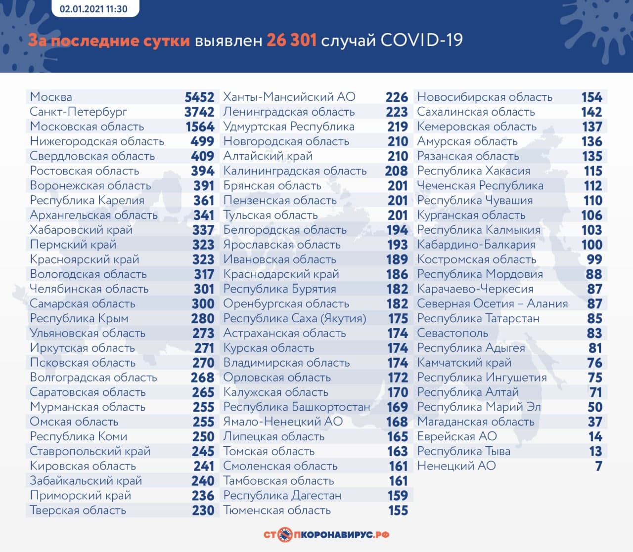 По данным Оперативного штаба, за последние сутки по состоянию на 2 января 2021 года в России подтверждены 26 301 случай заболеваемости коронавирусом в 84 регионах, из них 3 889 случаев (14,8%) активно у контактных лиц и не имели клинических проявлений болезни.