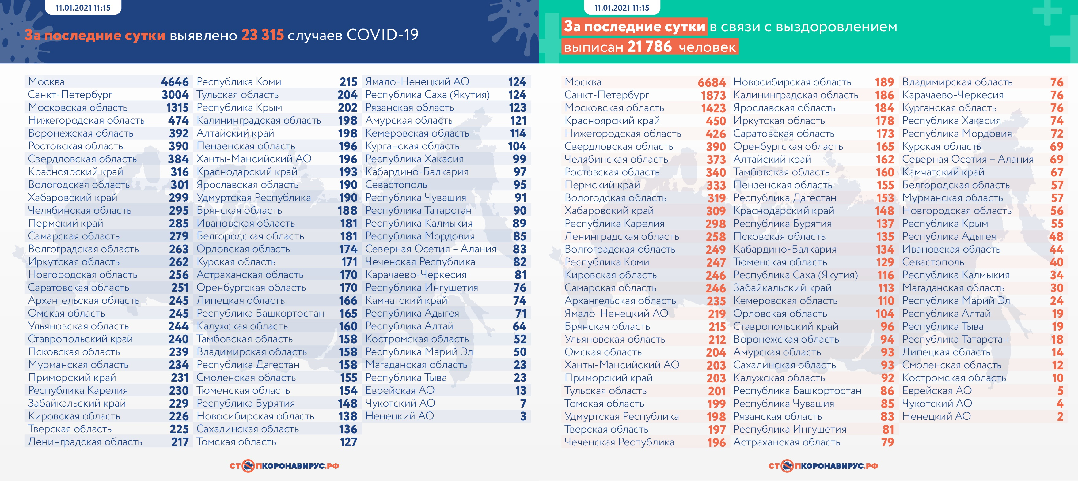 Всего за последний день в России выявлено 23 315 случаев COVID-19 в 85 регионах, из них 2 805 (12,0%) — активно у контактных лиц без клинических проявлений болезни. С начала пандемии в нашей стране зафиксировано 3 425 269 случаев (+0,7%) ковида в 85 регионах, а число выписанных пациентов выросло до 2 800 675. Летальных случаев за все время — 62 273.