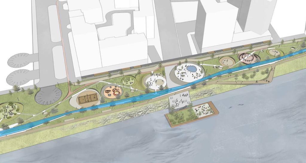 В проекте предусмотрены «комнаты» для отдыха детей, спорта, йоги, культурных мероприятий, пляж. Территория нового парка будет иметь природный ландшафт.