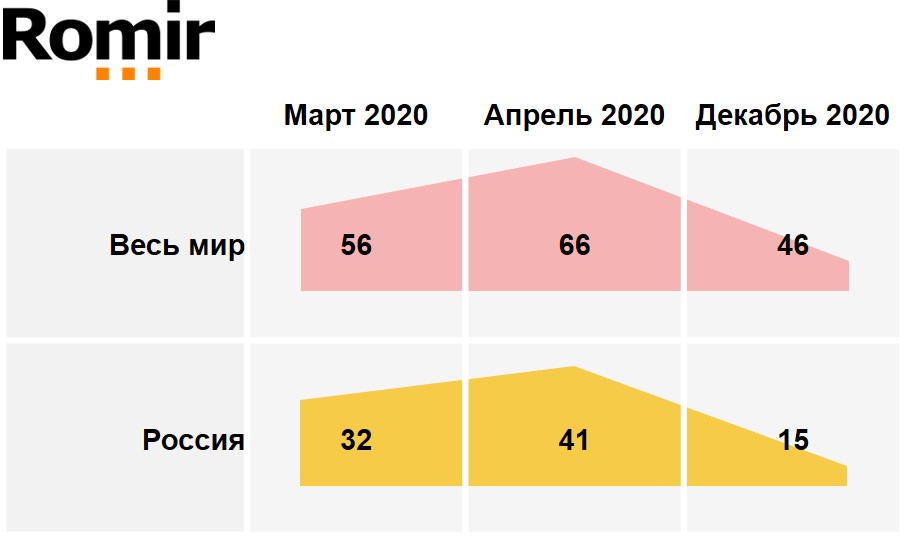 Со слов президента «Ромира» Андрея Милехина, жители устали от ограничительных мер и масочного режима. В Gallup International также добавили, что такие результаты ниже мирового уровня. Лидерами в данном вопросе стали жители Вьетнама (96%), Грузии (90%) и Кот-д'Ивуара (88%). В США положительно на вопрос социологов ответили 65%, в Западной Европе — 75%. Нетерпимее россиян к условиям локдауна оказались жители Японии (47%), Мексики (41%) и Палестины (40%).