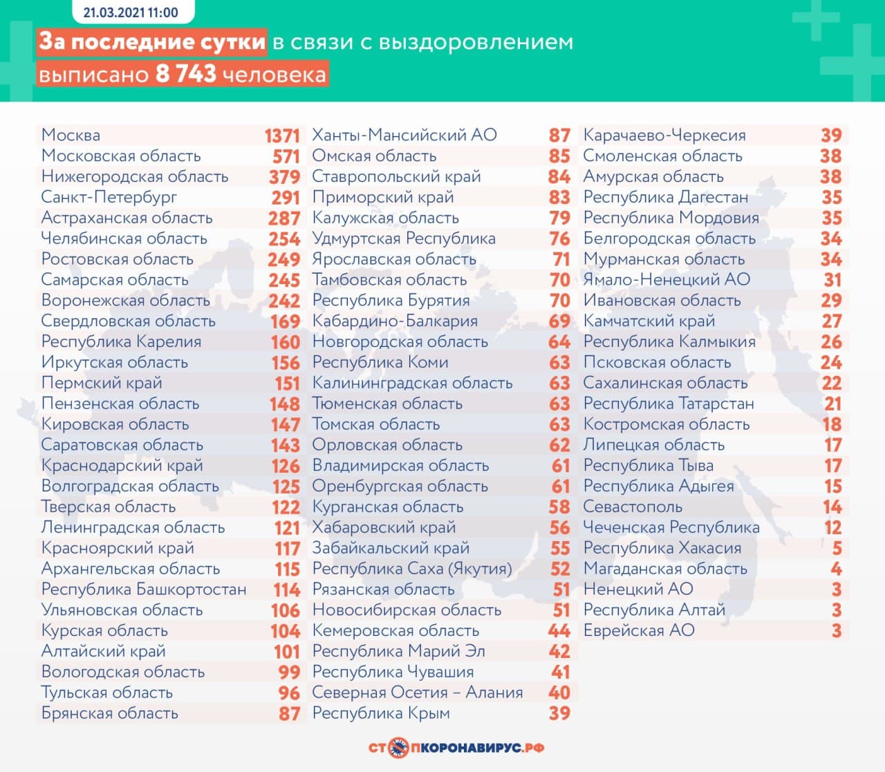 В России за 20 марта коронавирусом заболели еще 9 299 человек, выздоровели 8 743 пациента. Также за сутки в стране скончался 371 человек. За все время COVID-19 выявлен у 4 456 869 россиян, количество выздоровевших увеличилось до 4 069 395. На сегодняшний момент в стране от новой инфекции погибли 95 030 человек.