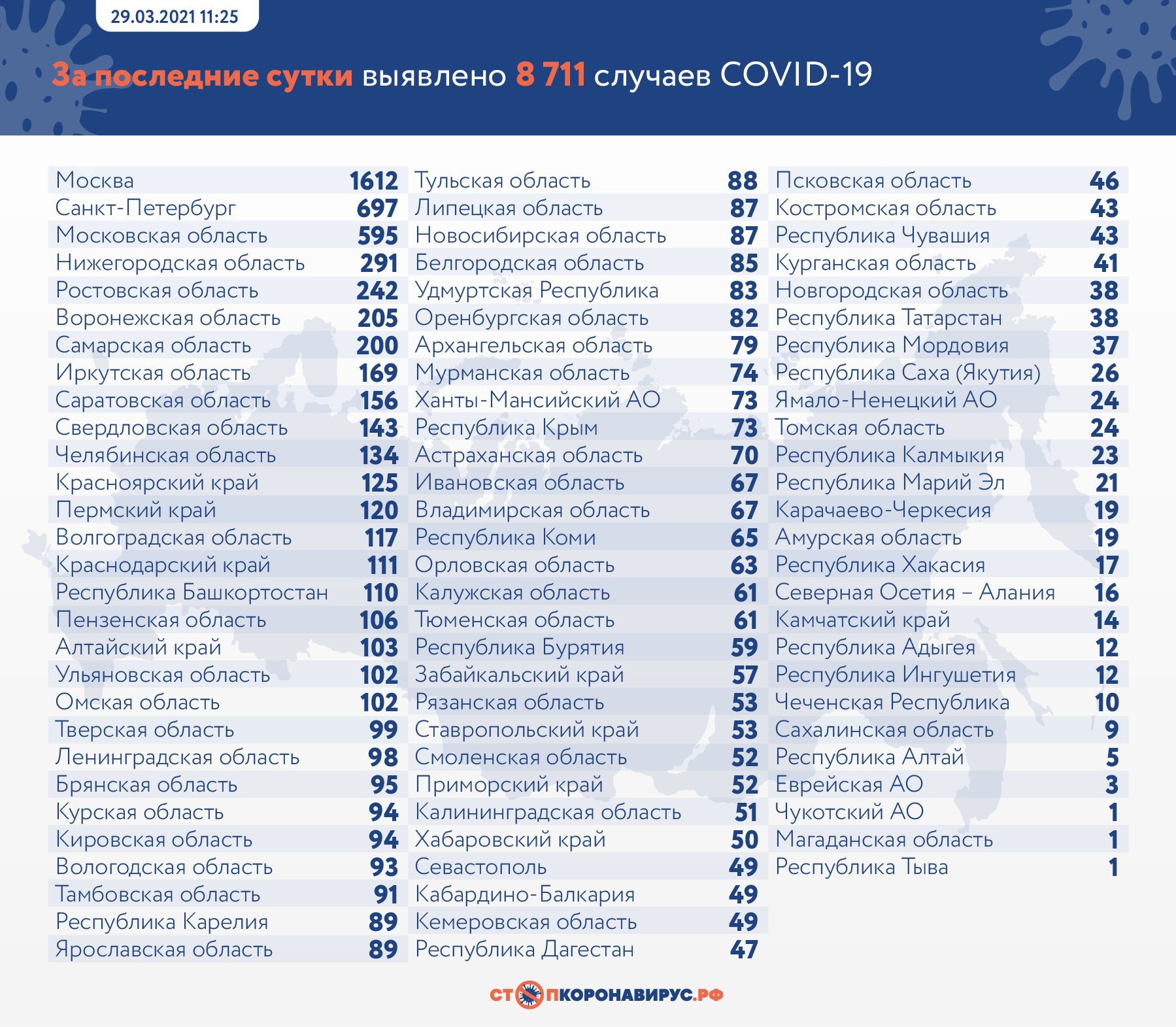 По данным на 29 марта, в России выявлено 8 711 случаев коронавируса, 7 280 пациентов выписаны по выздоровлении, скончалось 293 человека. За весь период количество заболевших увеличилось до 4 528 543, выздоровело 4 146 408. Также на сегодняшний момент количество летальных случаев составляет 98 033.