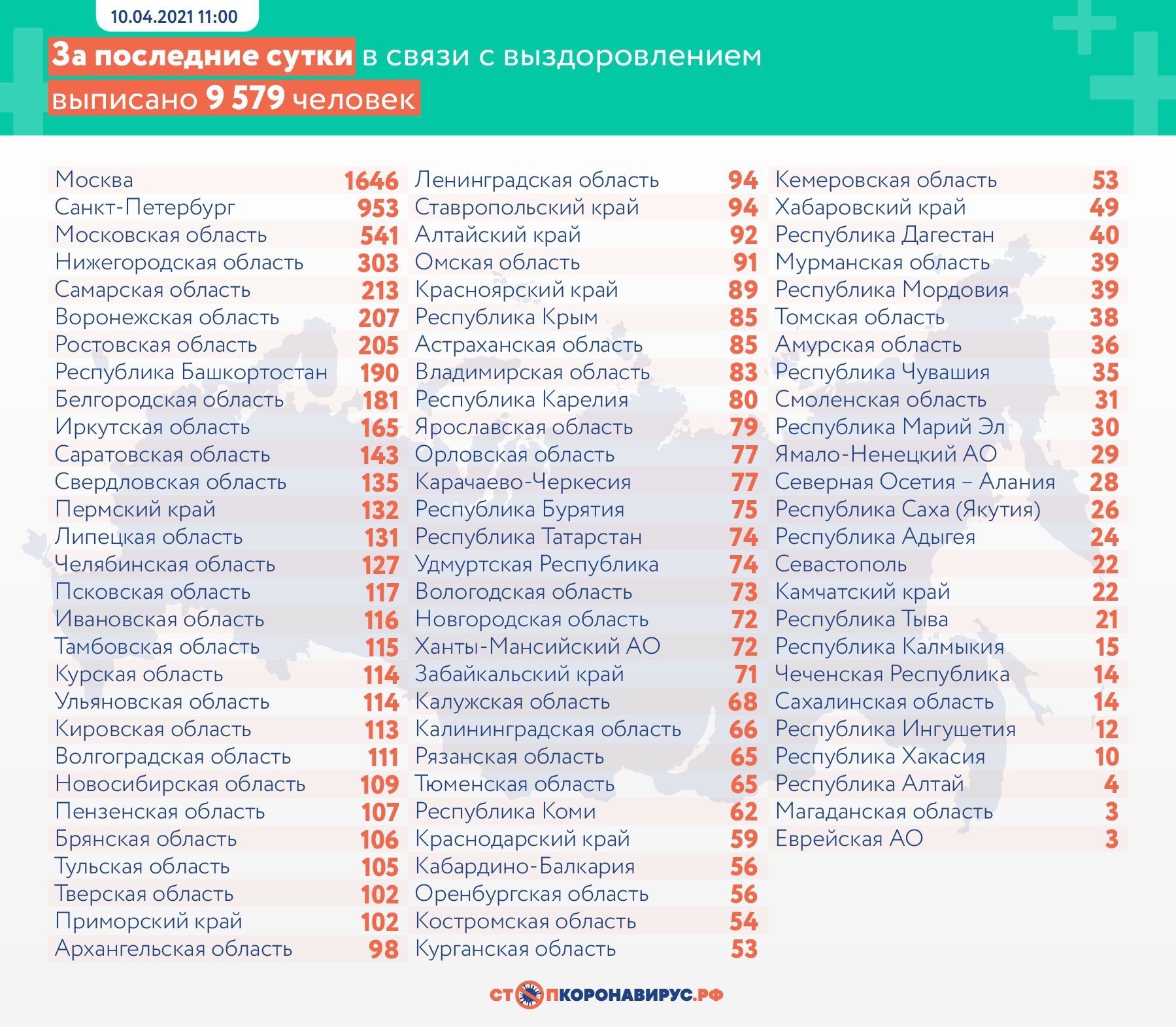 По данным федерального оперштаба на 10 апреля, в России за минувшие сутки заболели еще 8 704 человека, выписаны по выздоровлении 9 579 пациентов. За сутки в стране скончалось 402 человека.