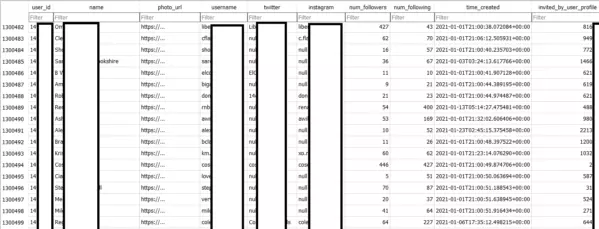 Однако мошенники все равно могут использовать данные открытых источников для фишинговых атак или для подбора паролей. В базе на сайте есть ID пользователя, имя, фото, никнейм, привязанные профили Твиттера и Инстаграма, количество подписчиков, количество людей, на которых пользователь подписан, дата создания аккаунта и имя пользователя, который дал инвайт.