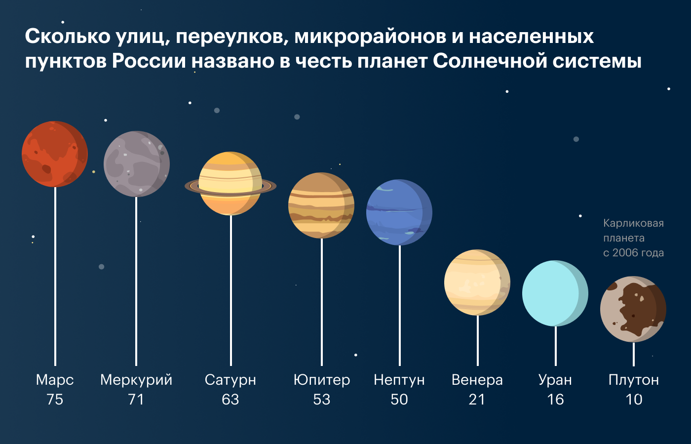 По данным исследования, в городе есть сразу два самых популярных топонима на «космическую» тему — парк Гагарина и одноименная улица. В честь Владимира Комарова в Тюмени назвали микрорайон, улицу и деревню. На окраине областной столицы также есть улица Титова и Леонова и деревня Терешковой.