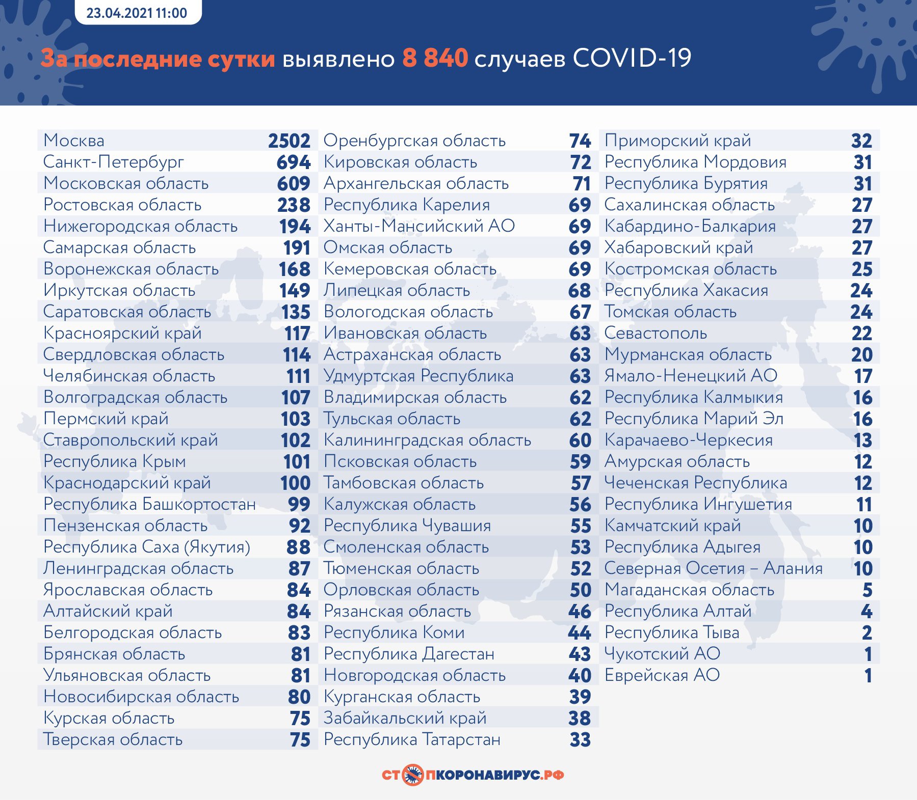 В России за 22 апреля заболели еще 8 840 человек, выписаны по выздоровлении 9 407 пациентов, 398 человек скончались. За весь период количество заболевших увеличилось до 4 744 961, выздоровело 4 371 214 пациентов. Также за все время в стране скончался 107 501.