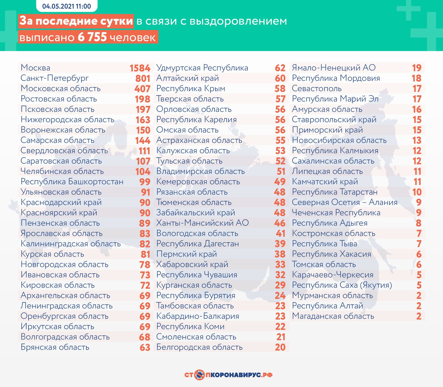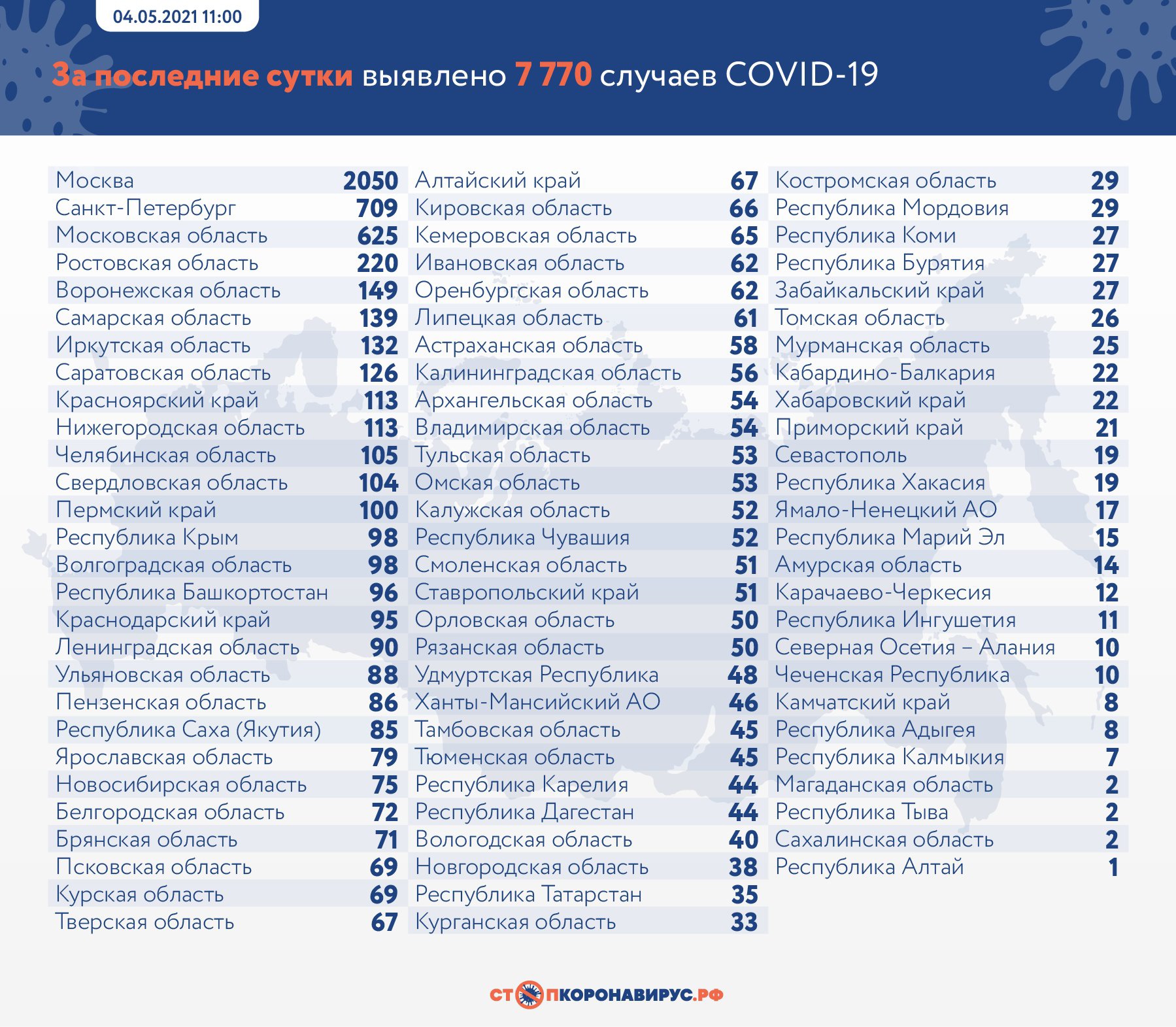 В России за 3 апреля заболели 7 770 человек, выписаны по выздоровлении 6 755 пациентов. За сутки в стране скончалось 337 человек. За весь период количество заболевших россиян увеличилось до 4 839 514, выздоровевших стало 4 457 044, погибло — 111 535 человек.
