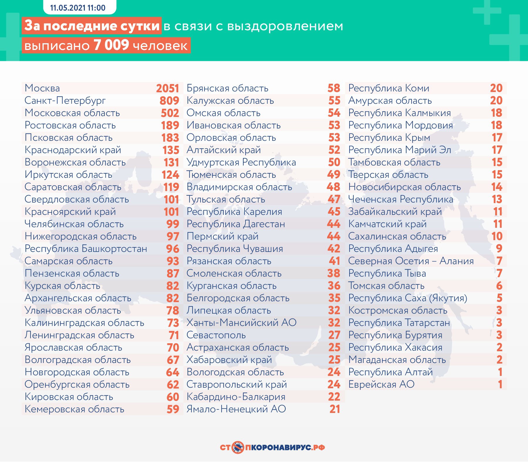 За все время пандемии в России зарегистрировано 4 896 842 случая коронавирусной инфекции, а число выписанных пациентов выросло до 4 509 915. Всего скончались 113 976 человек.
