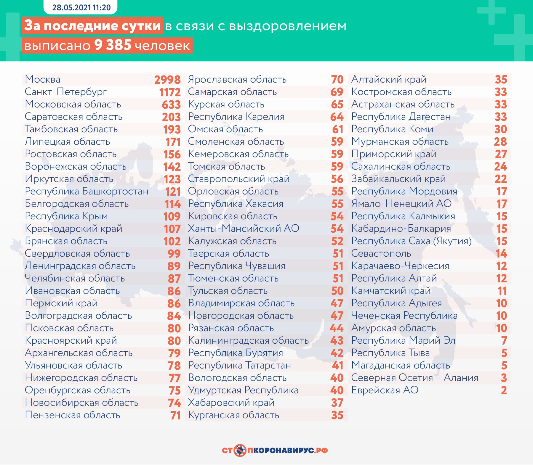 В России за 27 мая заболели 9 252 человека, выписаны по выздоровлении 9 385 пациентов. Также за сутки в стране зафиксировано 404 летальных исхода.