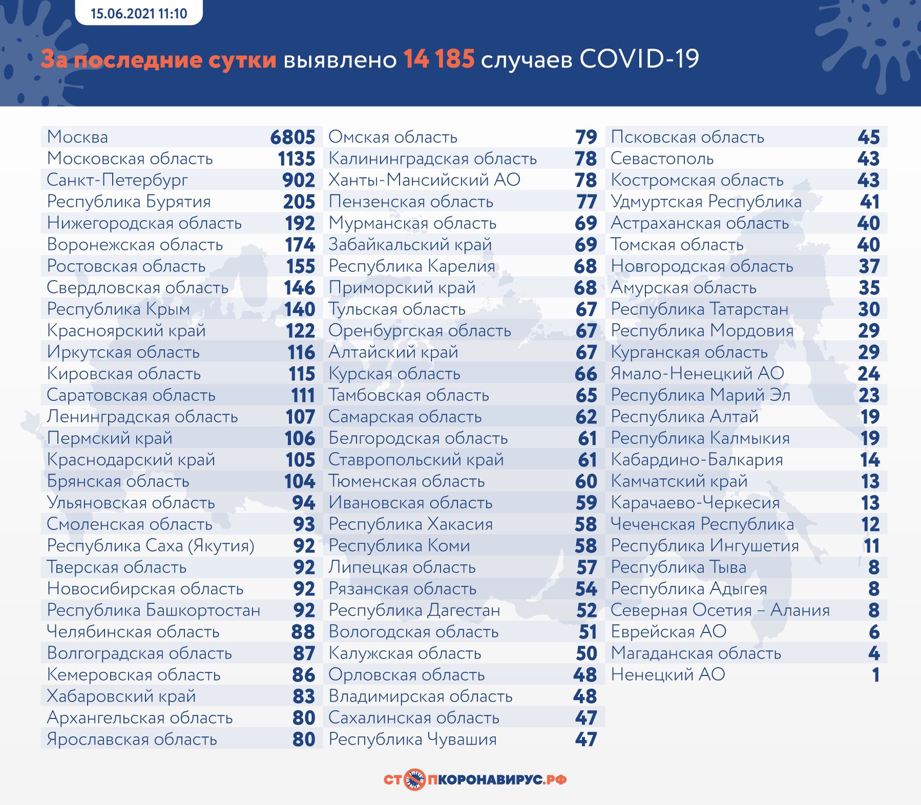 За тот же период по стране зафиксировали 14 185 новых заражений COVID-19, причем 2 124 больных переносят инфекцию бессимптомно. Из больниц выписаны 8 597 человек, скончались от осложнений 379 россиян. Под наблюдением врачей остаются 583 781 пациент.