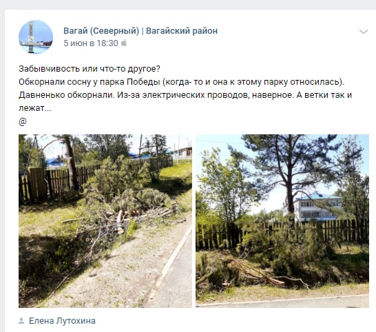 Ранее в селе Вагай проводились плановые работы по очистке электрических сетей от веток. После завершения процедуры не все деревья были вывезены с территории улицы. На срубленные сосны начали жаловаться жители села в сообществе «ВКонтакте».