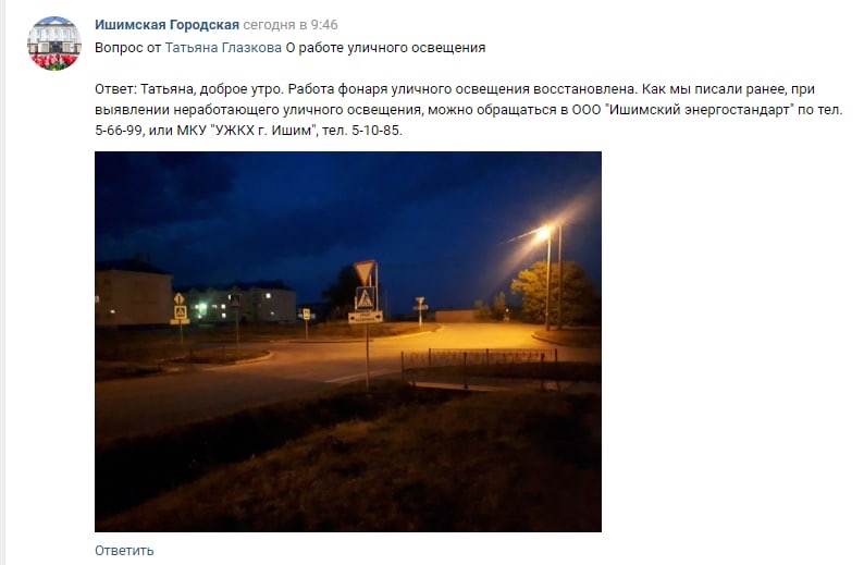 Ранее на странице Администрации города Ишим в «ВКонтакте» появилось сообщение с жалобой на отсутствие уличного освещения на улице Калинина. В частности жительницу Ишима Татьяну Глазкову тревожил неосвещенный перекрёсток и переход к дому №126.