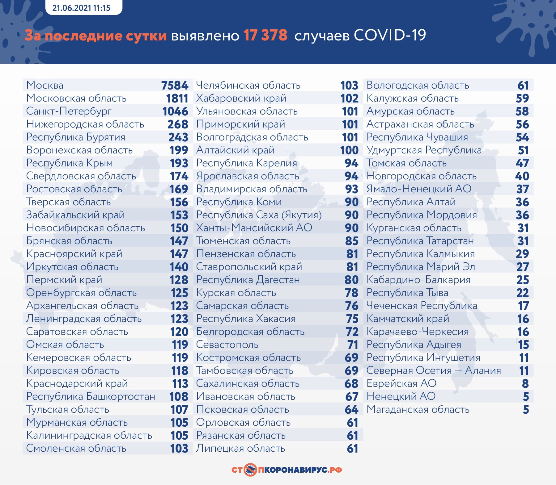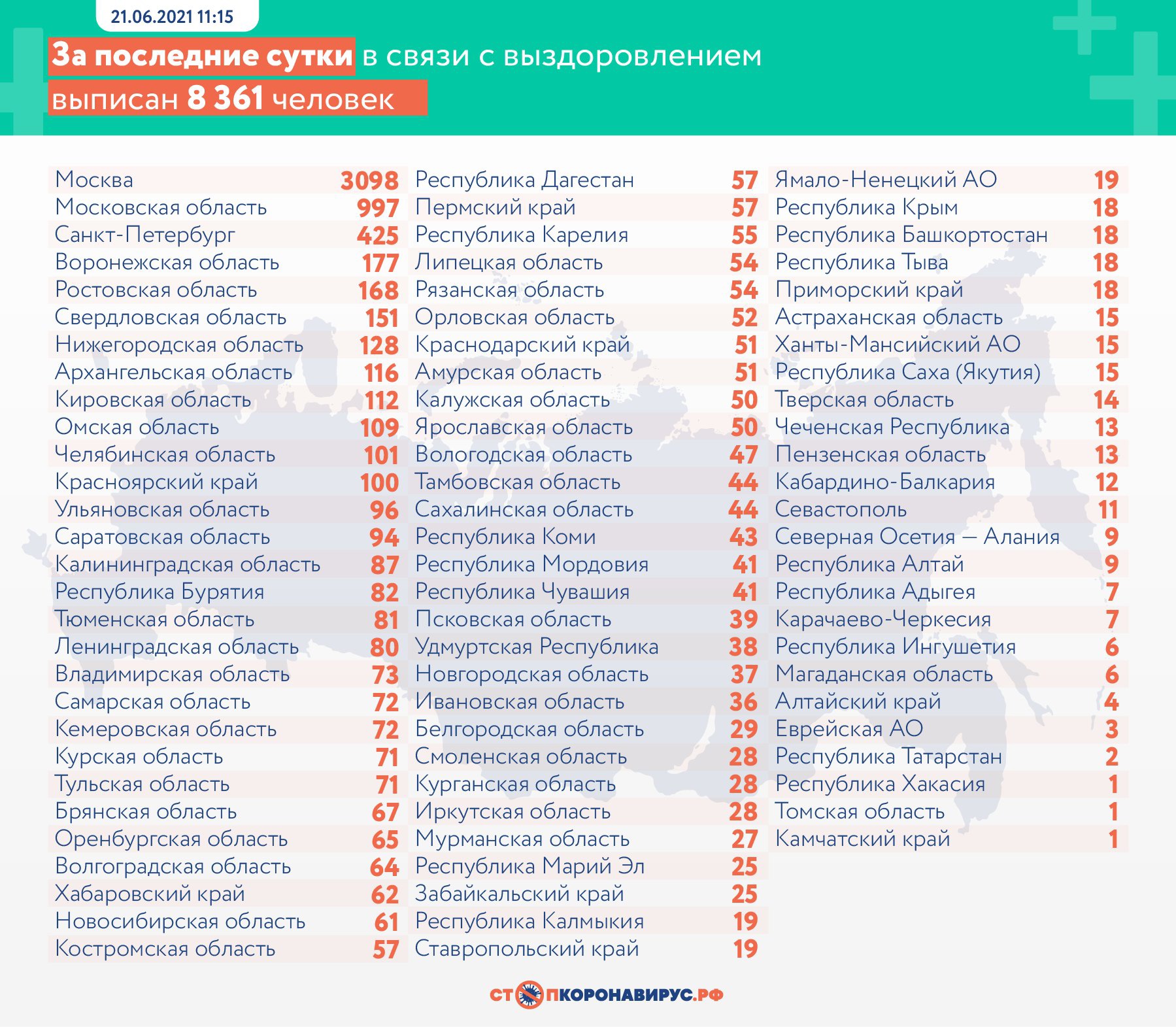 За тот же период по всей стране выявлено 17 378 случаев COVID-19, причем 3 003 человека, шестая часть зараженных, болеют бессимптомно. Из больниц выписано в два раза меньше — 8 361 россиянин. Скончались 440 больных.