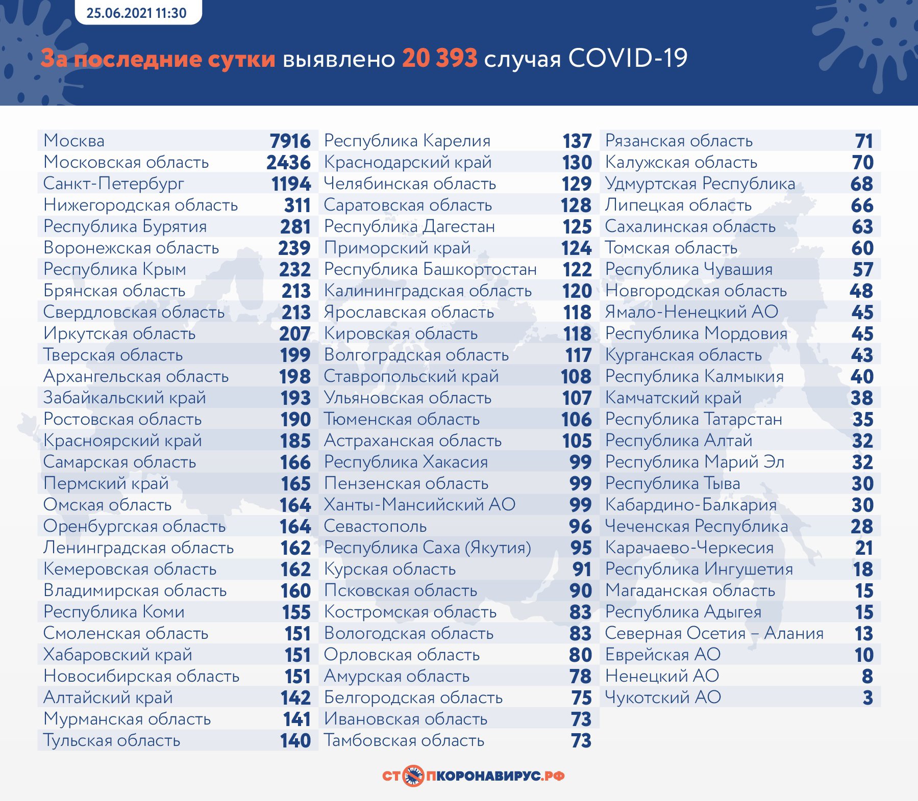 По данным федерального оперштаба, за 24 июня в России коронавирус выявлен у 20 393 человек, за сутки в стране выздоровело 14 024, скончался от осложнений 601 человек. За все время инфекцию выявили у 5 409 088 россиян, 4 929 639 жителей страны выздоровело. На сегодняшний момент от COVID-19 в России погибли 132 064 человека.