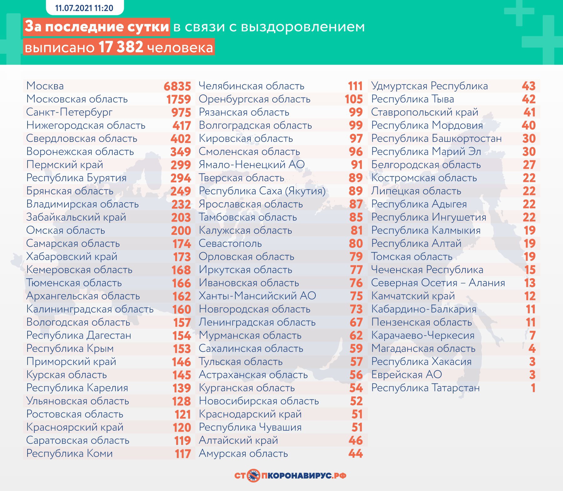 За тот же период по всей стране выявлено 25 033 случая COVID-19, причем 2 781 человек, восьмая часть зараженных, болеют бессимптомно. Из больниц выписано 17 382 человека, а под наблюдением врачей находятся более миллиона, 1 118 118. За сутки скончались 749 человек.