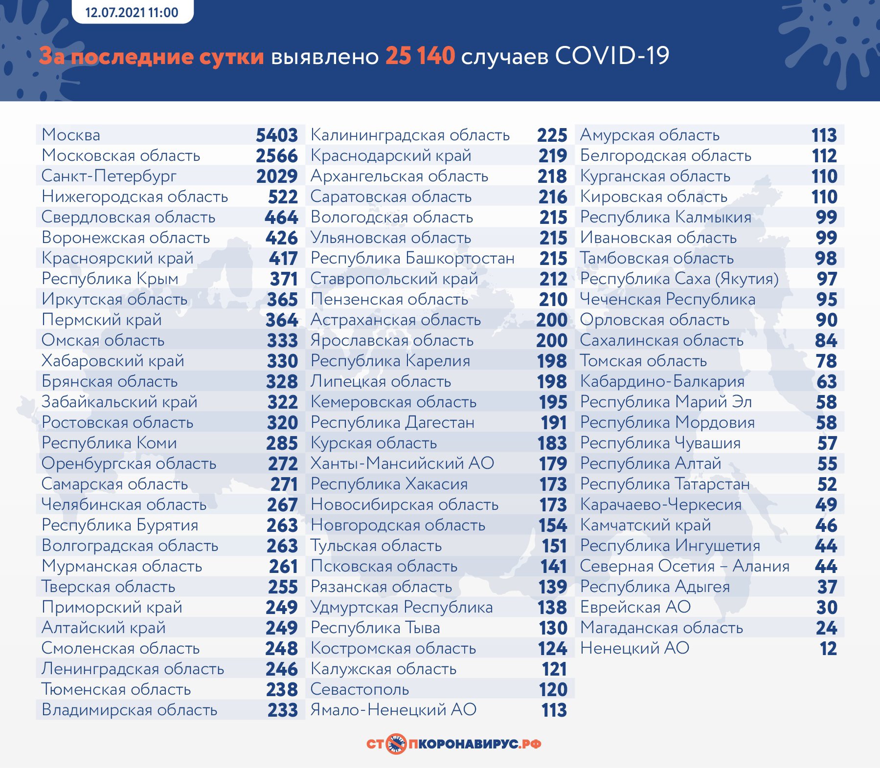 В России за минувшие 24 часа выявлено 25 140 случаев заражения инфекцией, 16 429 пациентов выписаны по выздоровлении, скончались 710 человек. За все время в стране заболели 5 808 473 человека, выздоровели 5 216 648 пациентов, погибли 143 712 человек.