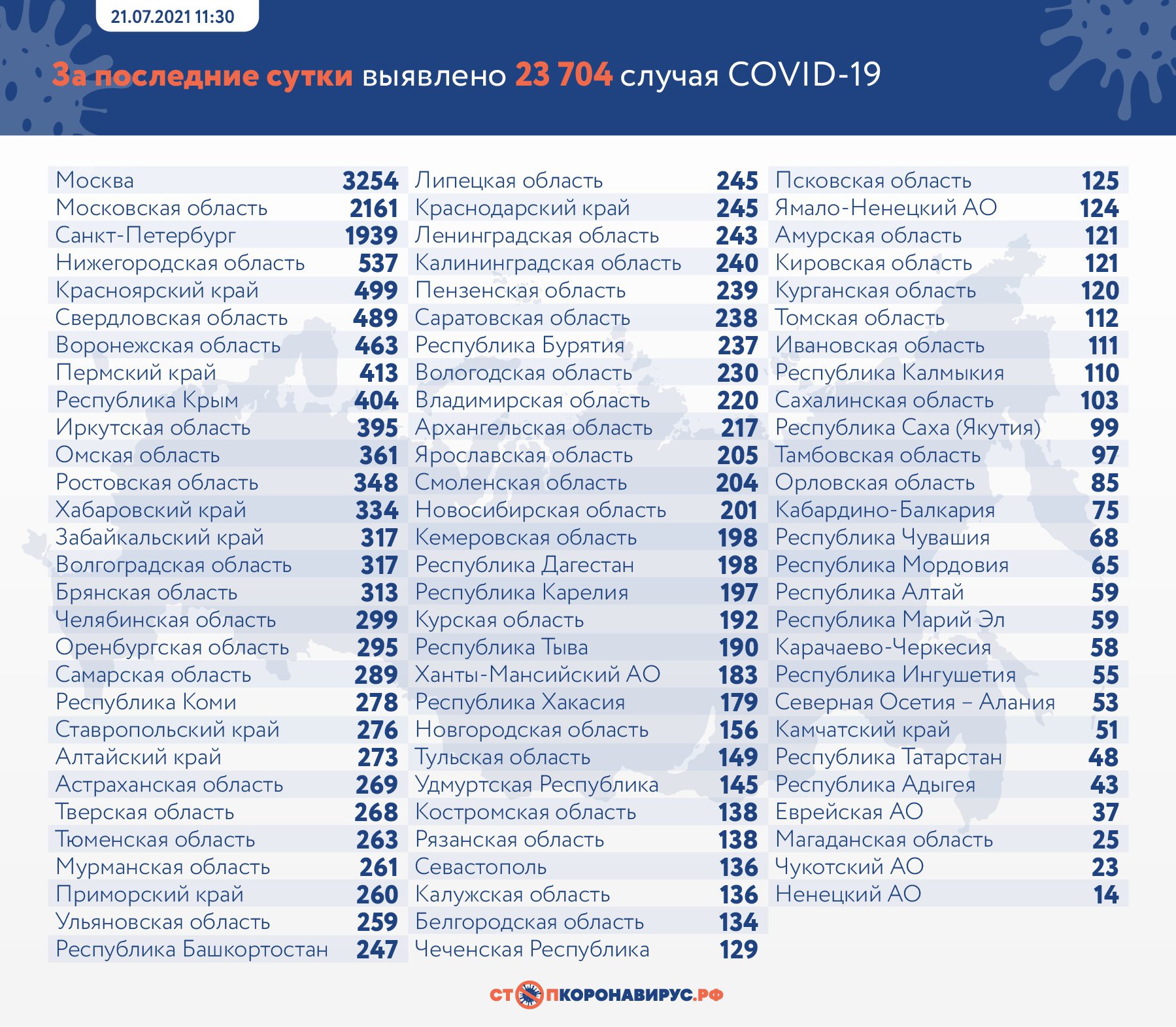 За все время пандемии в России зарегистрировано 6 030 240 случаев коронавирусной инфекции, а число выписанных пациентов выросло до 5 404 797. Количество летальных исходов составляет 150 705 человек.