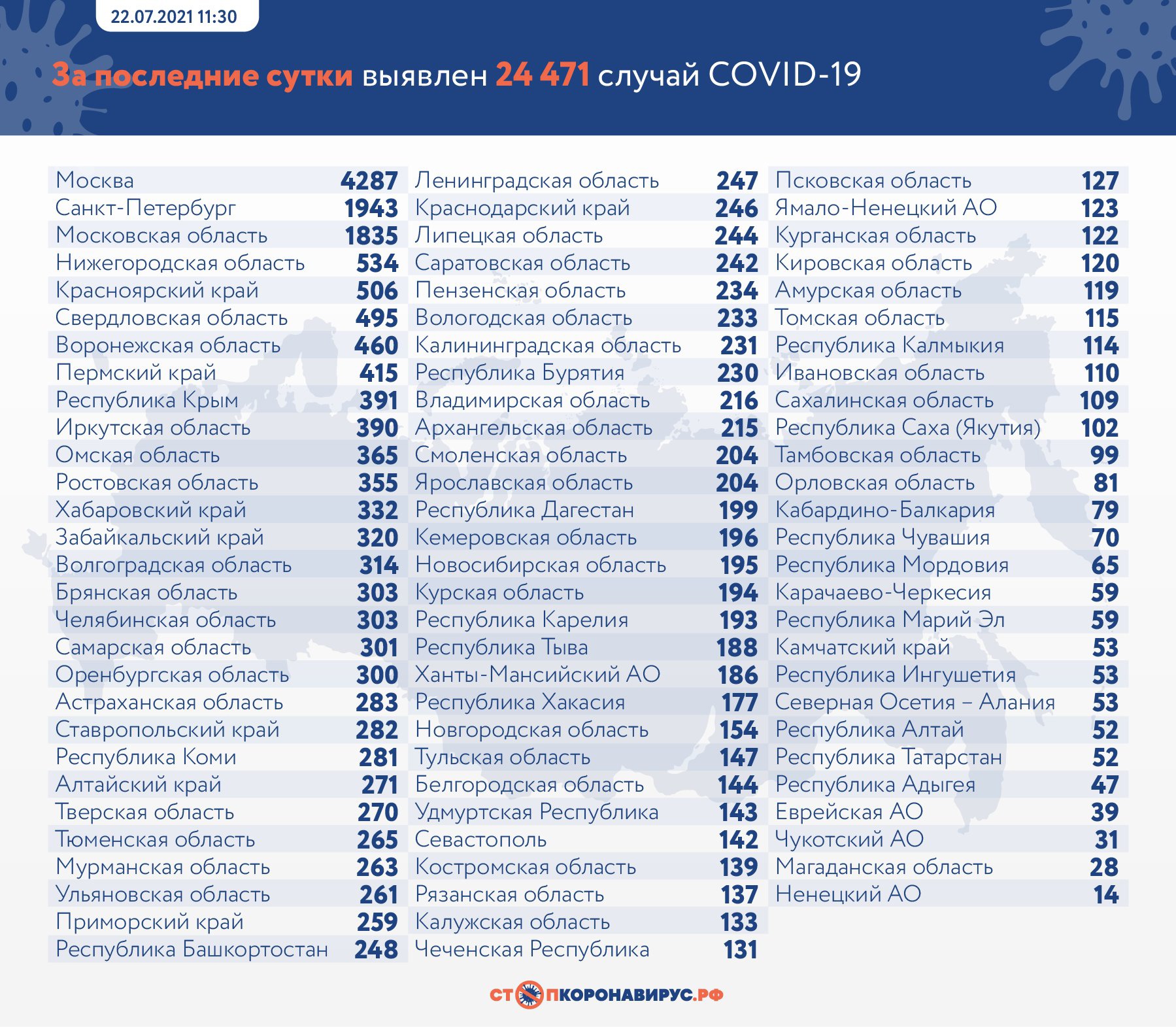 В целом по России за минувшие сутки выявили 24 471 случай коронавирусной инфекции, количество смертей составило 796. За весь период в стране заболели 6 054 711 россиян, погибли 151 501 житель.