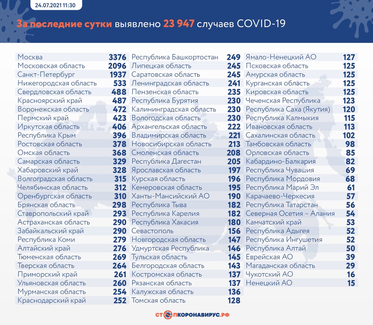 В России за прошедшие сутки выявили 23 947 случаев COVID-19 в 85 регионах (всего с начала пандемии 6 102 469), с выздоровлением выписано 21 952 жителя РФ (5 471 956 пациентов) и подтверждено 799 летальных исходов (153 095).