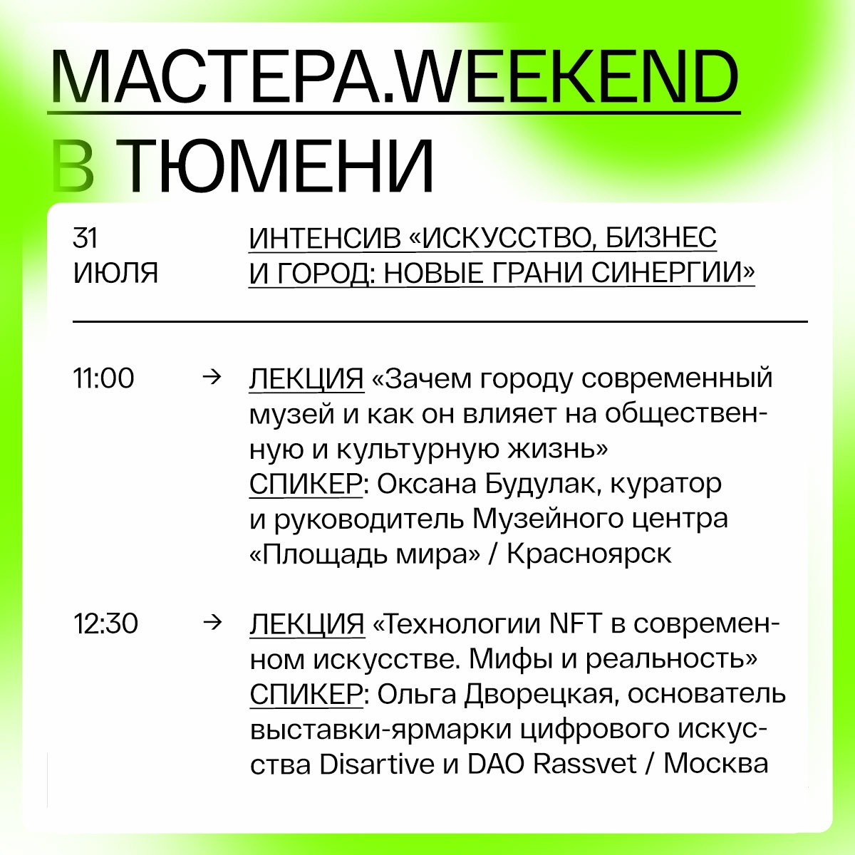 К примеру, 31 июля в 11:00 начнется лекция от куратора и руководителя Музейного центра «Площадь мира». Тема — «Зачем городу современный музей и как он влияет на общественную и культурную жизнь. В 12:30 основатель выставки-ярмарки цифрового искусства Disartive и Dao Rassvet из Москвы поделится мифами и реальностями технологии NFT в современном искусстве. Также лекции пройдут в 15:00 и 16:30, а 1 августа состоится воркшоп «Арт-развитие городских пространств».