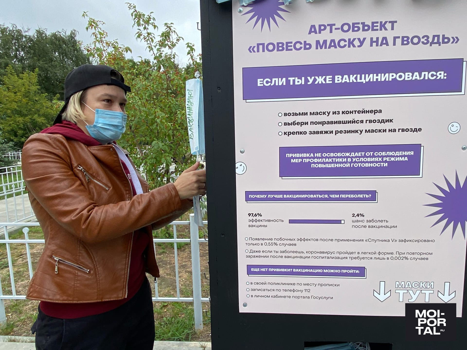 После вакцинации тюменцам было предложено повесить маску на гвоздь на арт-объекте, установленном неподалеку. По словам заместителя руководителя Медиацентра молодежной политики Валерии Ивановой, акция станет символом победы над коронавирусом:«Основной темой для обсуждения на данный момент является вопрос: ставить ли прививку от коронавирусной инфекции? Вакцинироваться нужно. После этой процедуры организм человека немного заболевает, при этом вырабатываются антитела. При наличии антител человек, столкнувшийся с инфекцией, либо переносит болезнь в легкой форме, либо не заболевает вообще. Перед вакцинацией обязательно нужно посетить терапевта, сдать анализы и узнать, есть ли какие-то противопоказания», — рассказала редакции Moi-portal.ru фельдшер городской поликлиники № 3 Юлия Мальцева.