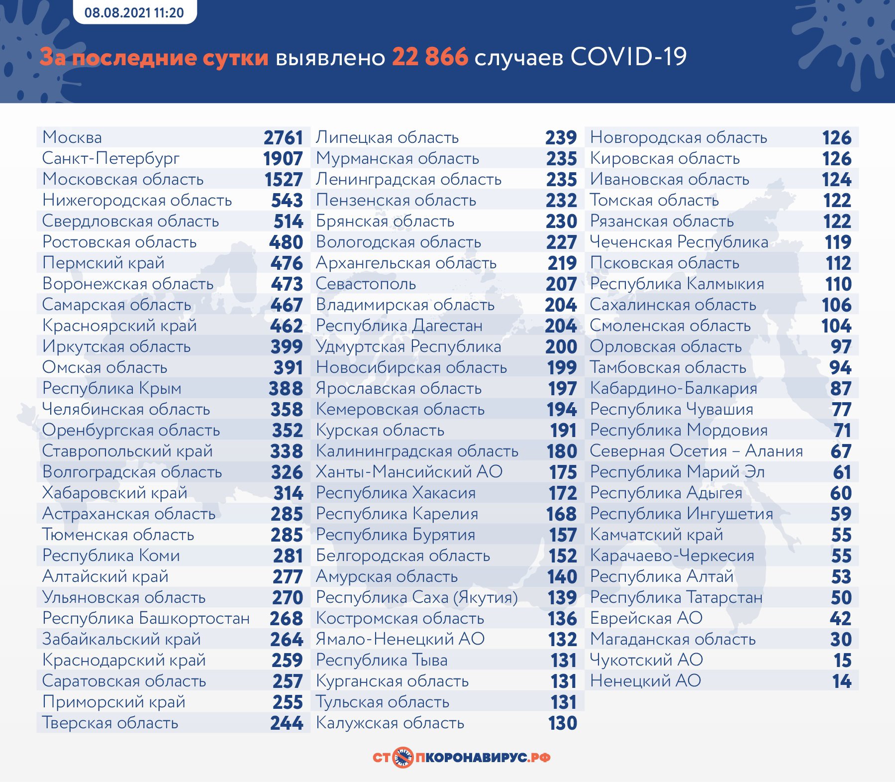 В России за сутки выявлено 22 866 случаев, выздоровели 15 669 пациентов, погибли 787 человек. За весь период в стране заболели 6 447 750 россиян, из них 5 755 507 выздоровели. Общее количество смертей от коронавирусной инфекции составляет 164 881 человек.
